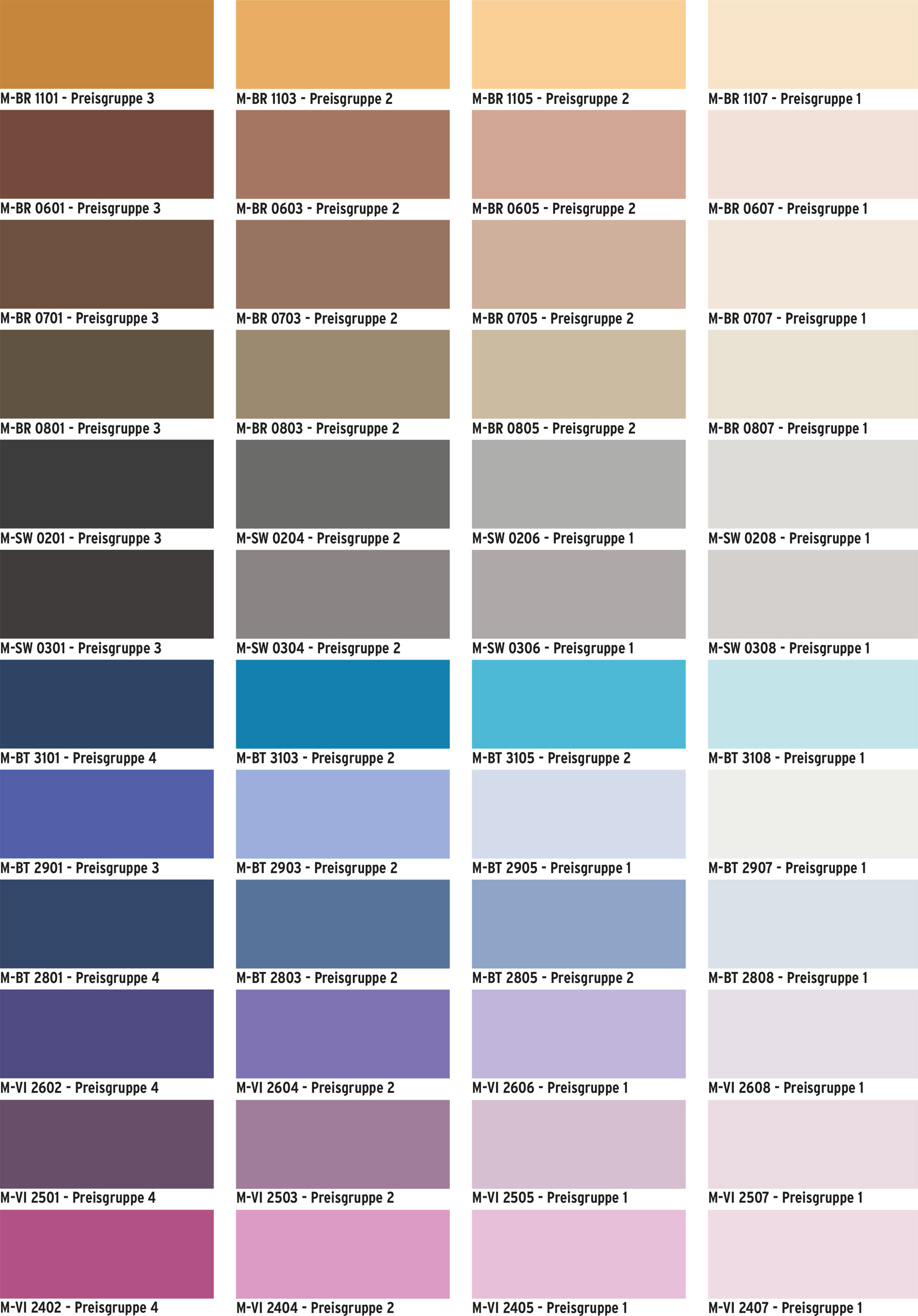 Die hier präsentierten Farben haben einen indikativen Wert und können je nach Art des Untergrundes variieren. Unterschiedlich eingestellte Monitore hinsichtlich Helligkeit und Kontrast lassen Farbunterschiede entstehen. Verbindlichkeiten hinsichtlich des Farbtones können daher nicht abgeleitet werden.